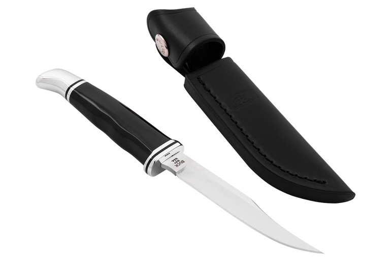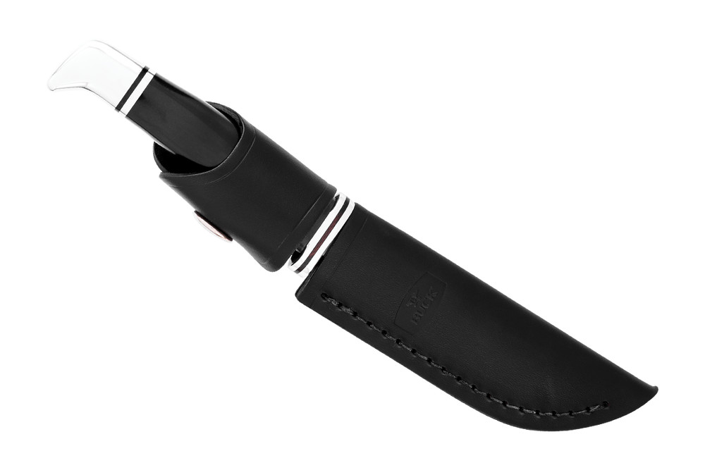 Buck Woodsman 102 - Phenolharz-Griff & Aluminiumbeschläge - Immer einsatzbereit ist das Jagd- und Outdoormesser "102 WOODSMAN" aus dem Hause Buck. Das Modell verfügt über eine feine Klinge aus rostfreiem 420HC-Stahl, die sich ideal zum Ausnehmen von Fisch und Kleinwild eignet. Zwischen der Abschlusskappe und der Parierstange aus Aluminium sitzt ein Griff aus Phenolharz. Im Lieferumfang inbegriffen ist eine hochwertige, schwarze Lederscheide.