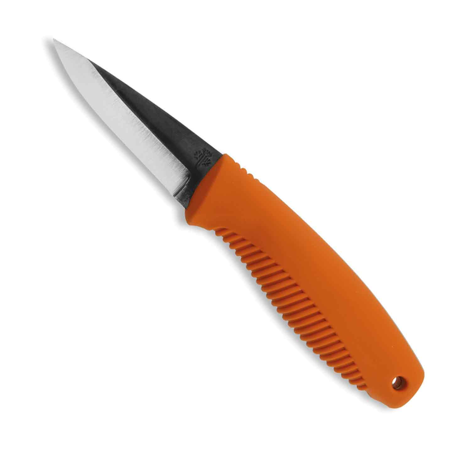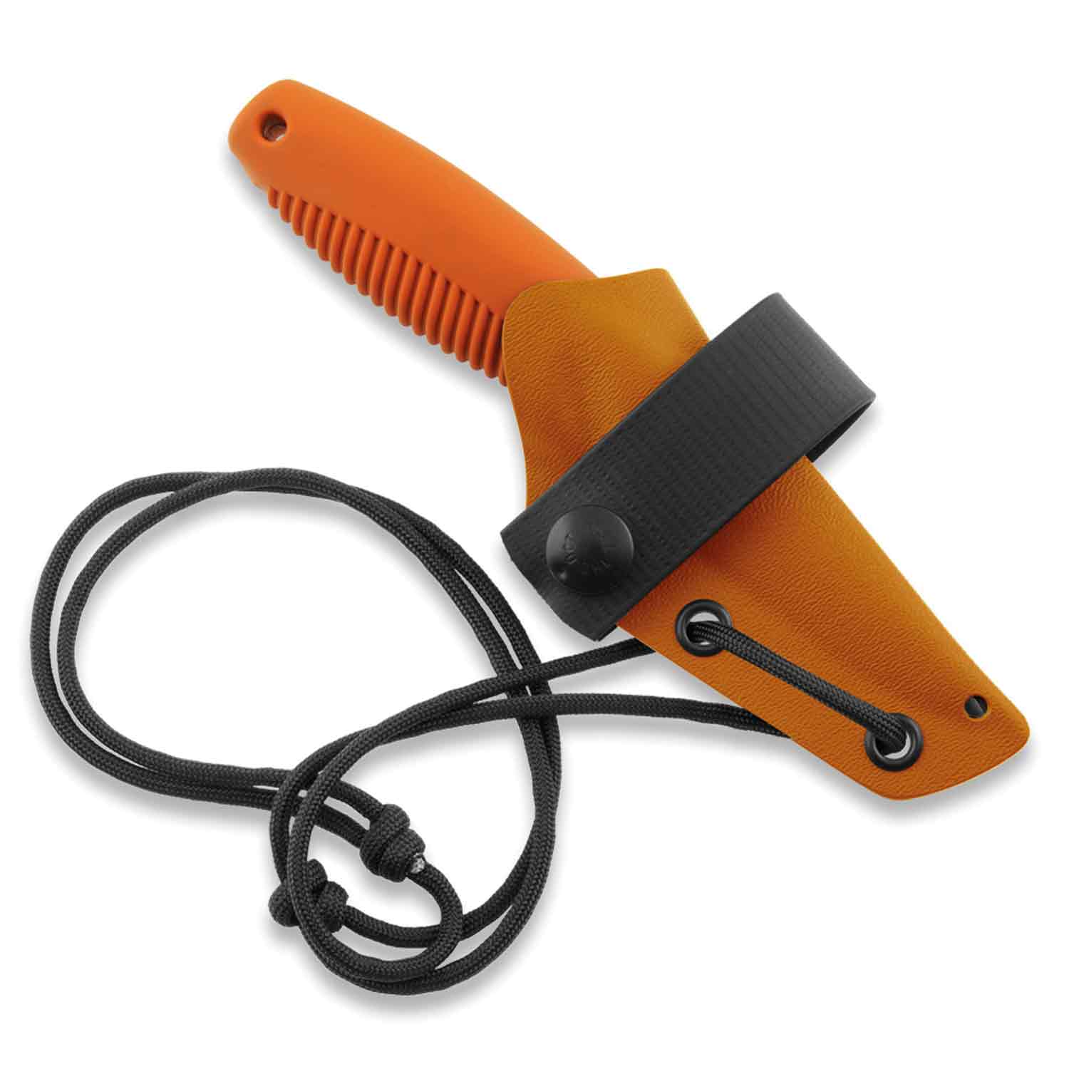 Peltonen M23 Ranger Cub signalorange mit einer kurzen 65 mm Klinge aus 80CrV2-Kohlenstoffstahl, Gesamtlänge 165 mm, Klingenstärke 3,2 mm, Gewicht 78 g, Lieferung inkl. Kydexscheide in signalorange.