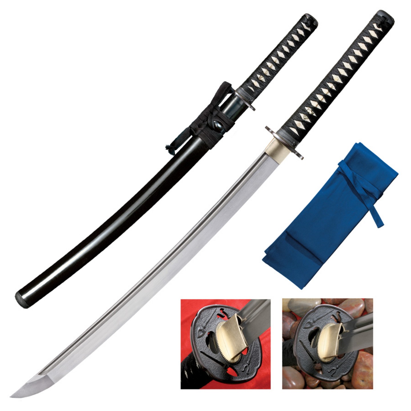 Das Cold Steel Chisa Katana aus der Warrior-Serie ist ein japanisches Schwert mit einer typischen Griffwickelung aus Rochenhaut (jap. Samé Hada), Griffband (jap.Tsuka-Ido) und klassisch verzierter Tsuba (Abtrennung von Klinge zum Griff). Beim Chisa Katana wurde als Klingenstahl hochwertiger 1060 Karbonstahl verwendet, der auf den Punkt genau gehärtet und anschliessend geschliffen wurde. Die Klingenlänge des Chisa Katana von Cold Steel beträgt ca. 62 cm und die Gesamtlänge ca. 91,5 cm. Das reine Gewicht liegt bei 1040 g (ohne Schwertscheide). Die Klingenstärke bträgt satte 8 mm. Lieferung erfolgt mit einer schwarz lackierten Holzscheide und einer blau-violetter Stoffetui für die stilgerechte Aufbewahrung.